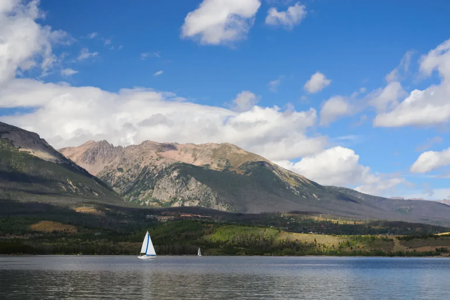 Perched at an elevation of 9,017 feet, Lake Dillon, also known as Dillon Reservoir, is a high alpine lake boasting gorgeous views of the peaks of the Ten Mile Range. It’s surrounded by the towns of Dillon, Silverthorne, and Frisco. Whether you are sailing, stand-up paddle boarding, or enjoying a walk or jog around the lake, the vistas are spectacular.